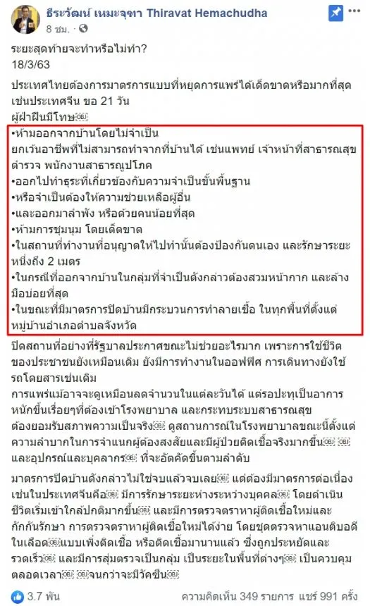 โดยนพ.ธีระวัฒน์ มองว่า มาตรการดังกล่าวนั้นไม่ได้ผลแล้วในขณะนี้ เพราะการใช้ชีวิตประจำวันของประชาชนยังเหมือนเดิม ยังมีการไปทำงานในออฟฟิศ การเดินทางยังใช้รถโดยสารเช่นเดิม พร้อมเสนอว่า ให้ประเทศไทยต้องใช้มาตรการสุดท้าย คือทำแบบเดียวกับประเทศจีน คือห้ามคนออกจากบ้านไปเลย 21 วัน หากไม่จำเป็นดังนี้