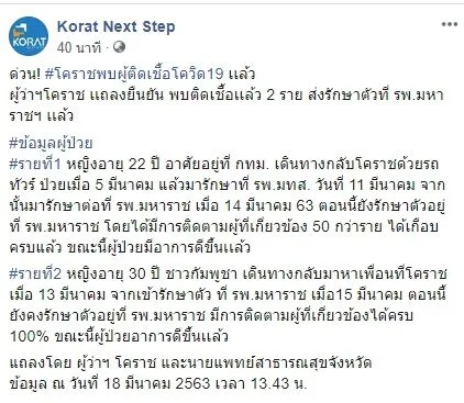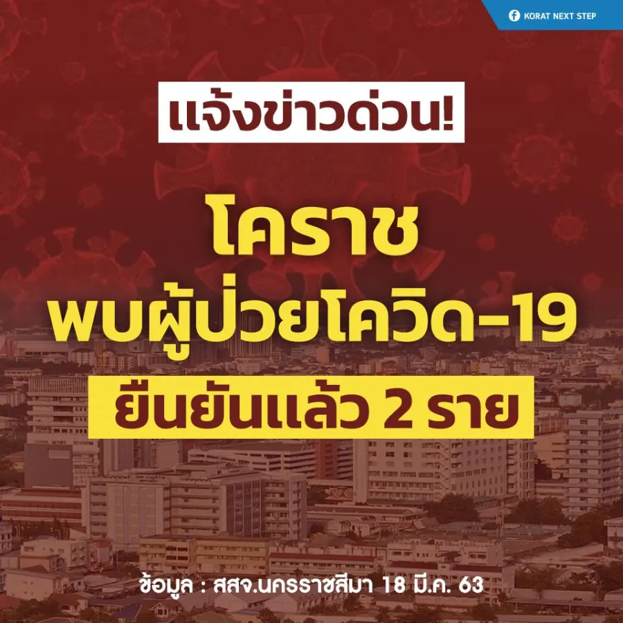 จากกรณีเมื่อวันนี้ ( 18 มีนาคม 2563 ) ที่เพจ Korat Next Step ได้รายงานว่า ด่วน โคราชพบผู้ติดเชื้อโควิด19 เเล้ว ผู้ว่าฯโคราช เเถลงยืนยัน พบติดเชื้อเเล้ว 2 ราย ส่งรักษาตัวที่ รพ.มหาราชฯ เเล้ว