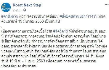 ล่าสุดที่เพจ Korat Next Step ก็ได้ระบุข้อความอัพเดทเพิ่มเติ่มว่า คำสั่งด่วน ผู้ว่าฯโคราชประกาศยืนยัน #สั่งปิดสถานบริการ14วัน มีผลตั้งแต่วันที่ 19 มีนาคม 2563 เป็นต้นไป