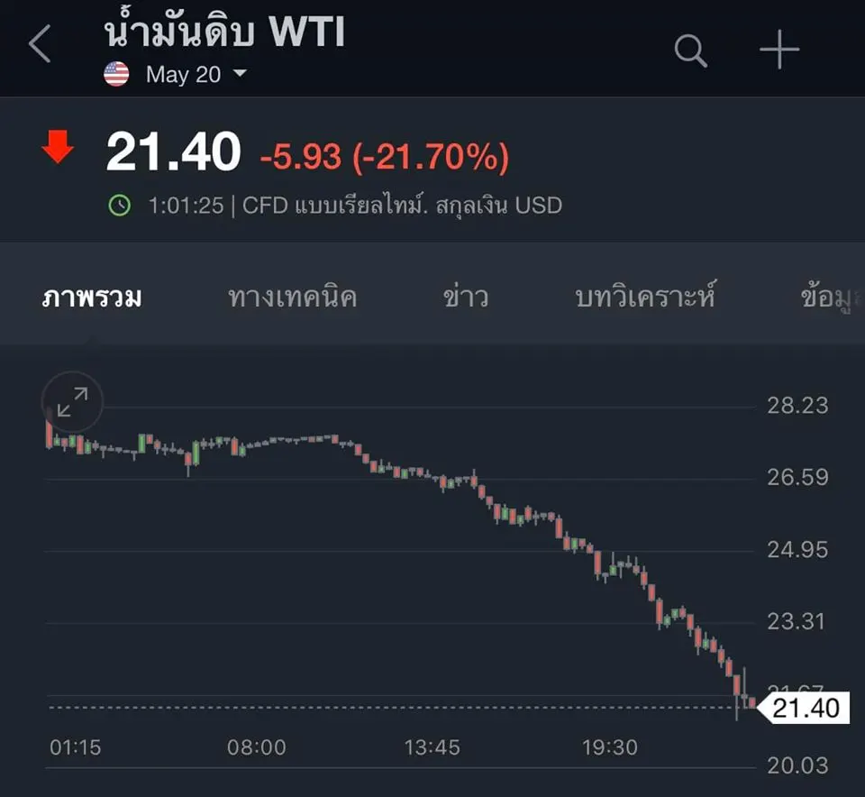[BREAKING] โดยเพจลุงทุนแมน/ น้ำมันดิบตอนนี้ ลดลง 21.7% ภายในวันเดียว ใครที่มีอายุต่ำกว่า 18 ปี เกิดมาจะไม่เคยเห็นน้ำมันดิบราคานี้ เพราะวันนี้น้ำมันดิบที่ราคา 21.4 ดอลลาร์ ต่อบาร์เรล เป็นจุดต่ำสุดในรอบ 18 ปี..