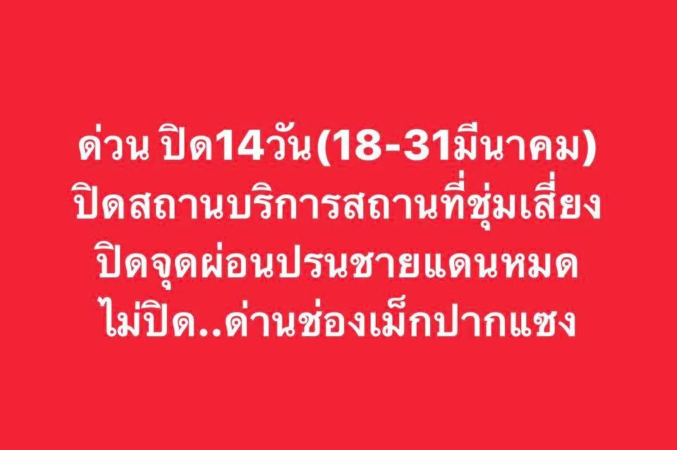 ขณะเดียวกัน เพจเฟซบุ๊ก อุบลวันนี้ ได้มีการโพสต์ข้อความประกาศว่า อุบลราชธานี ประกาศปิดเมืองชั่วคราว ตั้งแต่วันที่ 18 – 31 มีนาคม ปิดสถานบริการหรือสถานที่สุ่มเสี่ยง ปิดจุดผ่อนปรนชายแดนทุกจุด ยกเว้นด่านช่องเม็ก พร้อมระบุมาตรการดังนี้…