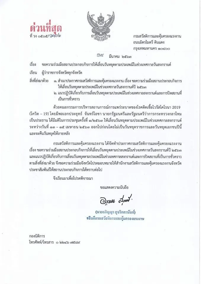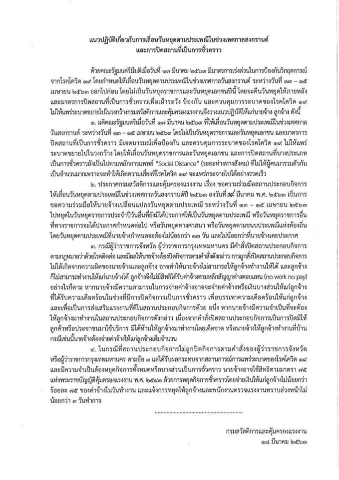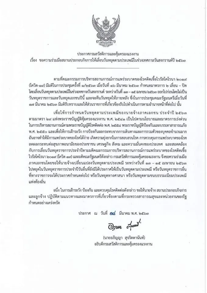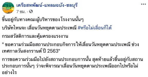 เมื่อวันที่ 19 มี ค เพจ เครือสหพัฒน์ แหลมฉบัง ชลบุรี ได้ออกมาโพสต์ข้อความระบุว่า ขึ้นอยู่กับทางคณะผู้บริหารของโรงงานนั้นๆ บริษัทไหนจะ เลื่อนวันหยุดตามประเพณี หรือไม่เลื่อนก็ได้ กรมสวัสดิการและคุ้มครองแรงงาน ขอความร่วมมือสถานประกอบกิจการให้เลื่อนวันหยุดตามประเพณี ช่วงเทศกาลวันสงกรานต์ ปี 2563 การขอความร่วมมือไปยังสถานประกอบการนั้น สุดท้ายแล้วขึ้นอยู่กับสถานประกอบการนั้นๆ ว่าจะพิจารณา เลื่อนวันหยุดตามประเพณีออกไปหรือไม่อย่างไร สถานประกอบการใด ไม่เลื่อนวันหยุดประเพณี ก็จะไม่มีความผิดใดตามข้อกฎหมาย เพราะเป็นเพียงการขอความร่วมมือเท่านั้น
