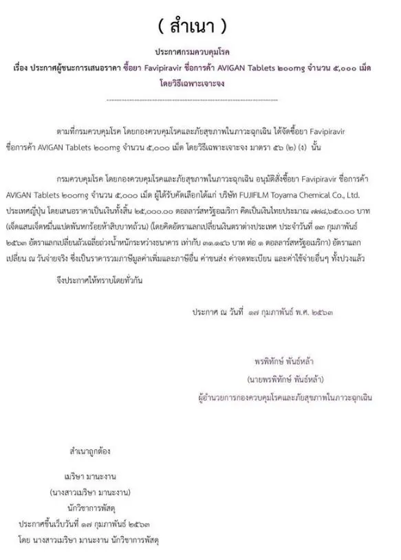 เมื่อวันที่ 18 มี ค 63 เพจดังได้เผยข้อมูลประเทศไทยได้สั่งซื้อยา Avigan หรือ Favipiravir จากญี่ปุ่น ตั้งแต่เดือนกุมภาพันธ์ 63 ล่าสุดประกาศใช้เพื่อรักษาผู้ติดเชื้อไวรัสโควิด-19 อย่างเป็นทางการแล้ว