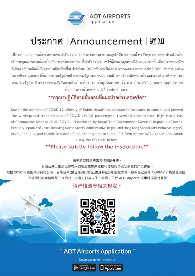 5 มีนาคม 2563 มีประกาศประเทศเขตติดโรค 4 ประเทศ 2 เขตปกครองพิเศษ (จนท ด่าน เรียก 4+2) ได้แก่ จีน อิหร่าน อิตาลี เกาหลีใต้ มาเก๊า ฮ่องกง มีมาตรการ ต้อง กรอกข้อมูล ต.8 มีผลตรวจทางห้องปฏิบัติการ COVID 19 และประกันสุขภาพ วงเงินไม่ต่ำกว่า 100,000 us และ มีมาตรการ Quarantine