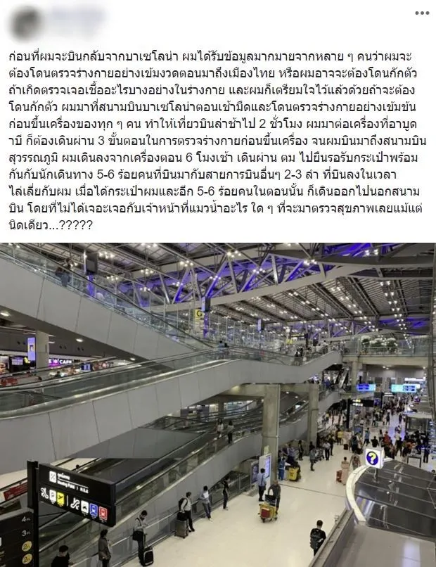 จากกรณีผู้ใช้เฟซบุ๊กรายหนึ่ง ซึ่งเป็นคนไทยที่เพิ่งบินกลับจากสเปน ประเทศซึ่งสถานการณ์ไวรัสโควิด-19 กำลังระบาดอย่างหนักเป็นอันดับต้นๆของโลก ได้เล่าถึงการเดินทางกลับประเทศไทย จนถึงสนามบินสุวรรณภูมิ เรียกได้ว่าเจอหลายๆอย่างผิดคาดไปหมด เเถมยังมีนักท่องเที่ยวมากับเครื่องบินไฟล์ทเดียวกันอีกหลายร้อยคน