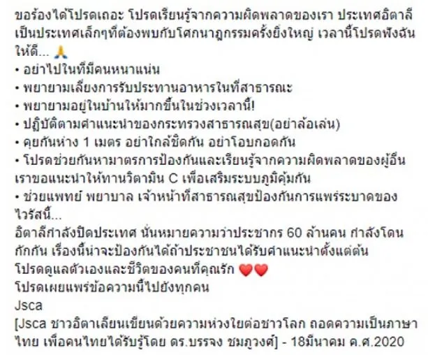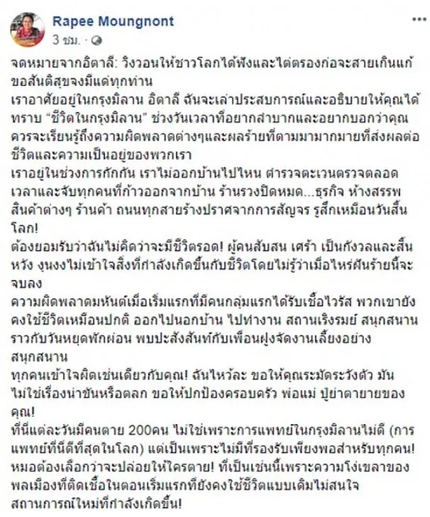 จาดสถานการณ์ไวรัสโควิด 19 ยังคงแพร่ระบาดอย่างต่อเนื่องไปทั่วโลก โดยเฉพาะในทวีปยุโรปที่มีตัวเลขผู้ติดเชื้อสูงขึ้นทุกวัน ง่าสุดเมื่อวันที่ 18 มีนาคม ผู้ใช้เฟสบุ๊ค Rapee Moungnont ได้โพสต์เกี่ยวกับกรณีดังกล่าว