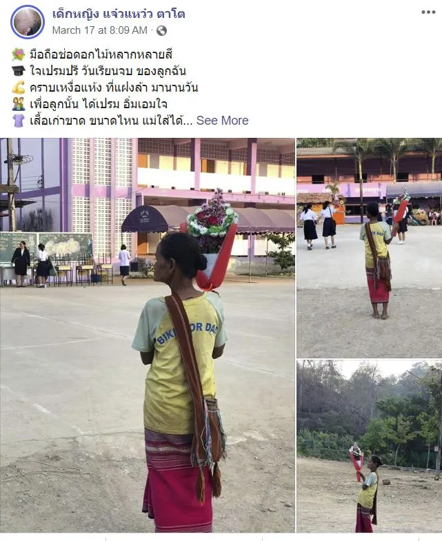 เเม่เดินเท้าเปล่า ถือช่อดอกไม้ เสื้อเก่าขาดขนาดไหนก็ใส่ได้ ยืนรอเเสดงความยินดี ในวันที่ลูกรักเรียนจบ