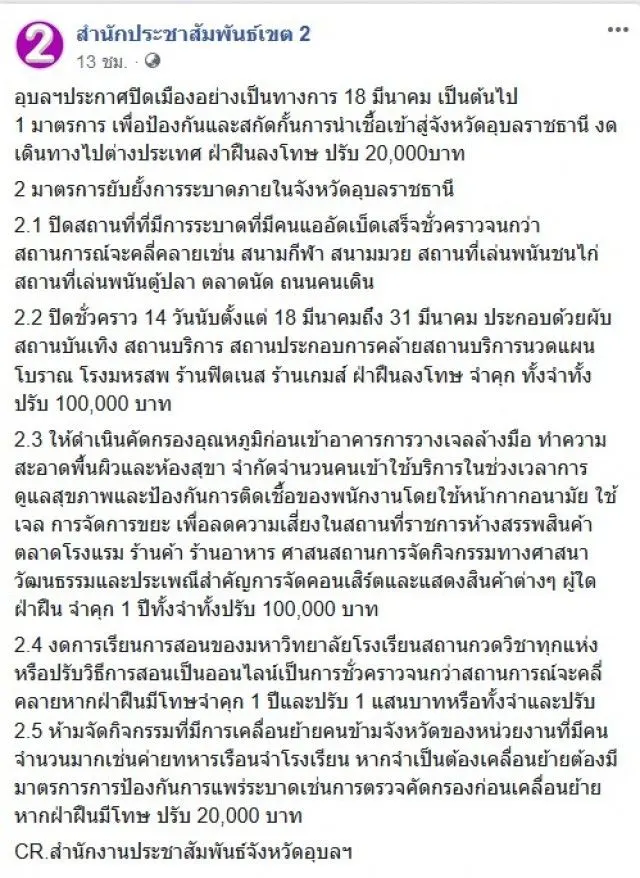 2 มาตรการยับยั้งการแพร่ภายในจังหวัดอุบลราชธานี