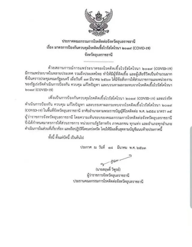 อุบลฯประกาศปิดเมืองอย่างเป็นทางการ 18 มีนาคม เป็นต้นไป
