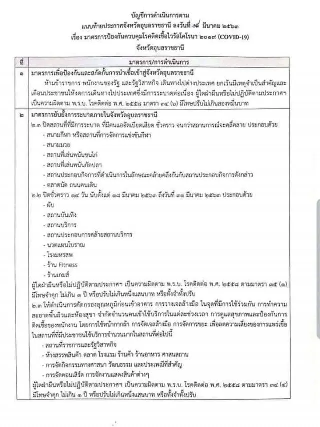 1 มาตรการ เพื่อป้องกันและสกัดกั้นการนำเชื้อเข้าสู่จังหวัดอุบลราชธานี งดเดินทางไปต่างประเทศ ฝ่าฝืนลงโทษ ปรับ 20,000บาท