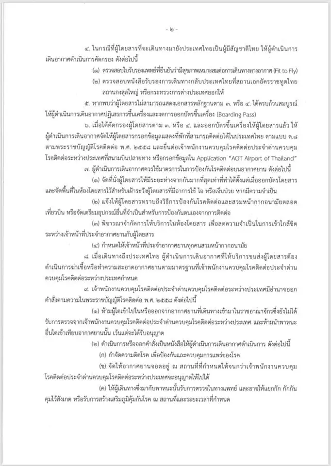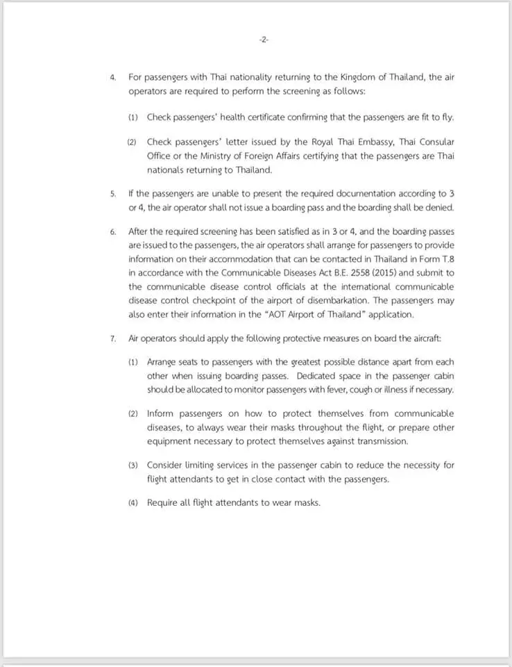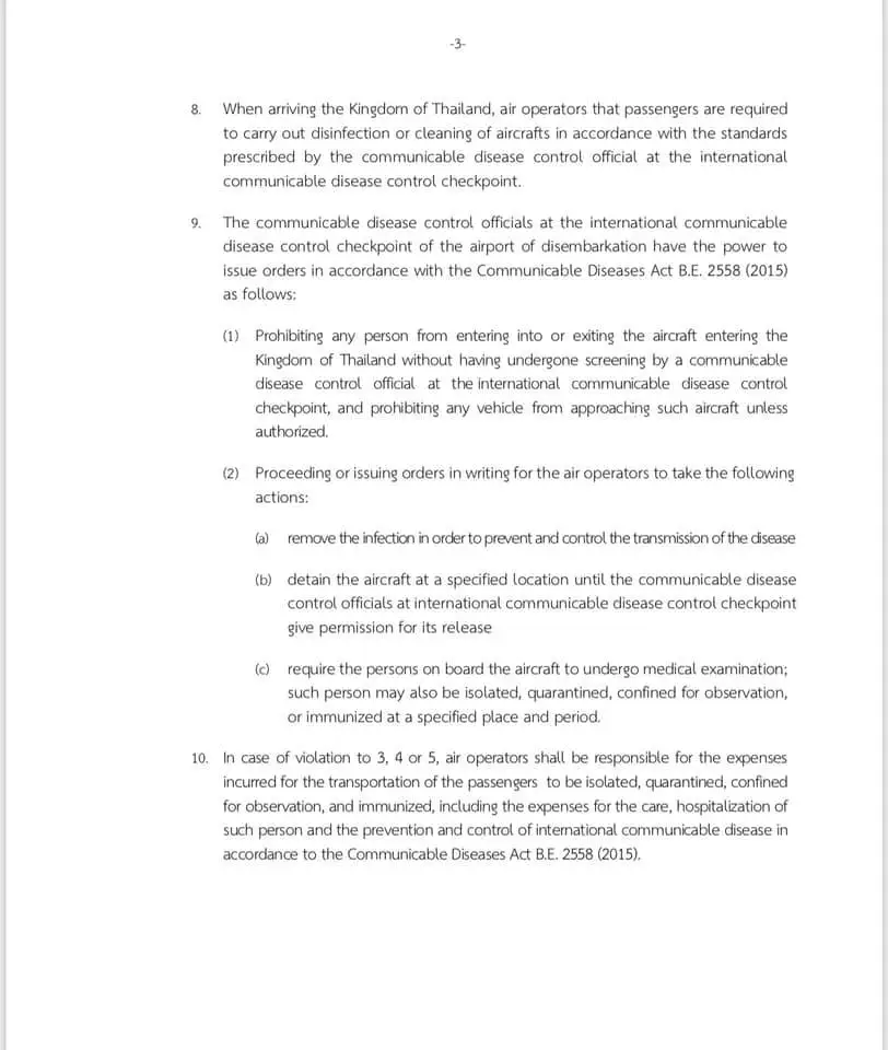 ให้ผู้โดยสารจากทุกประเทศ จะเข้าไทย ต้องมีใบรับรองแพทย์ ไม่เกิน 3 วันและมีประกันสุขภาพ จึงจะออก Broading past ให้เข้าไทยได้