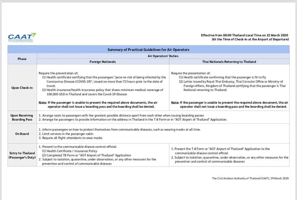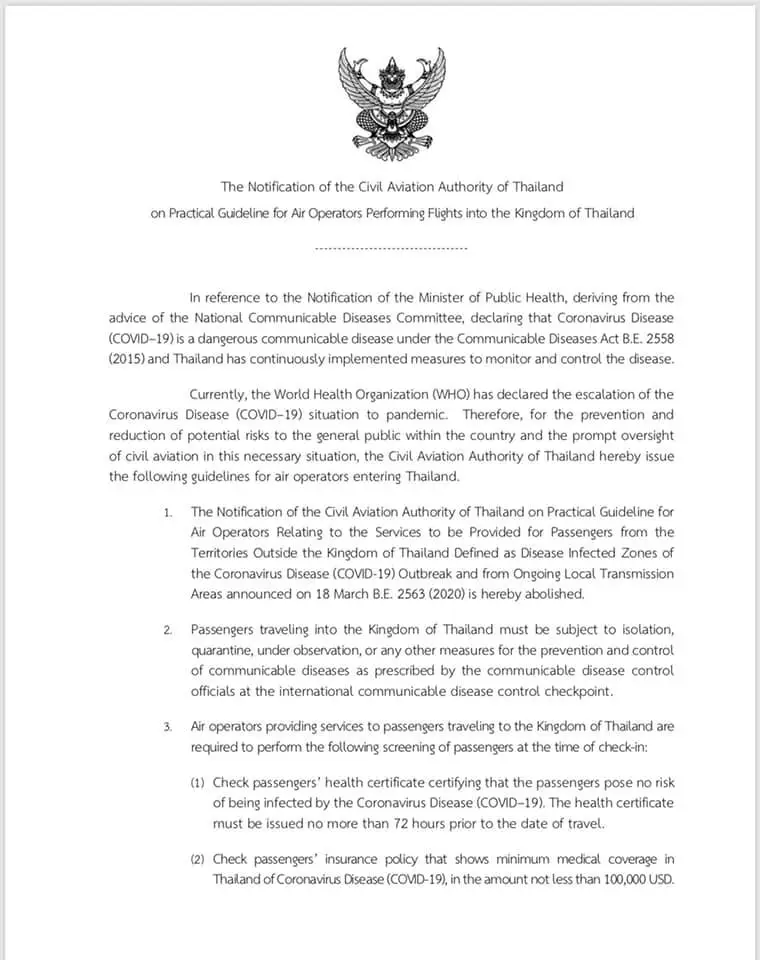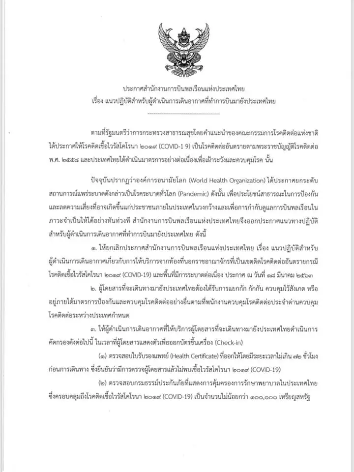 สำนักงานการบินพลเรือน จึง ออกประกาศสำนักการบินพลเรือนฉบับใหม่ เพื่อ ให้ผู้โดยสารทุกคน ต้อง ผ่านการตรวจจากแพทย์ และ มีใบรับรองแพทย์ ไม่เกิน 3 วัน รวมทั้งมีประกันสุขภาพ จำนวน 100,000 $ จึงจะสามารถออก boarding part และขึ้น เครื่องบินเดินทางมายัง ประเทศไทย ได้
