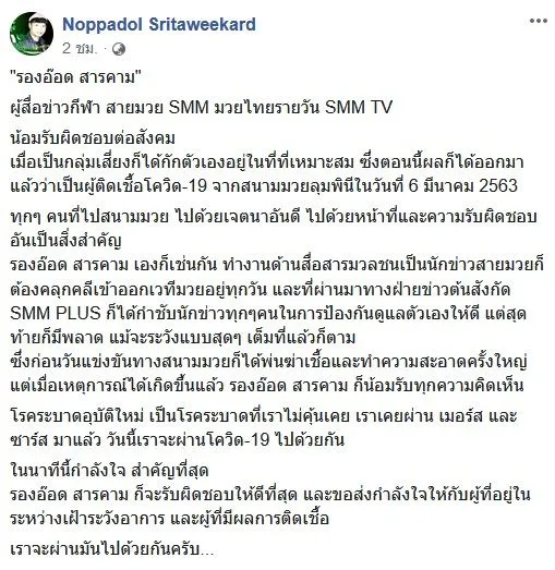 ในเฟซบุ๊ก Noppadol Sritaweekard โพสต์ข้อความระบุว่า “รองอ๊อด สารคาม”ผู้สื่อข่าวกีฬา สายมวย SMM มวยไทยรายวัน SMM TVน้อมรับผิดชอบต่อสังคม เมื่อเป็นกลุ่มเสี่ยงก็ได้กักตัวเองอยู่ในที่ที่เหมาะสม ซึ่งตอนนี้ผลก็ได้ออกมาแล้วว่าเป็นผู้ติดเชื้อโควิด-19 จากสนามมวยลุมพินีในวันที่ 6 มีนาคม 2563
