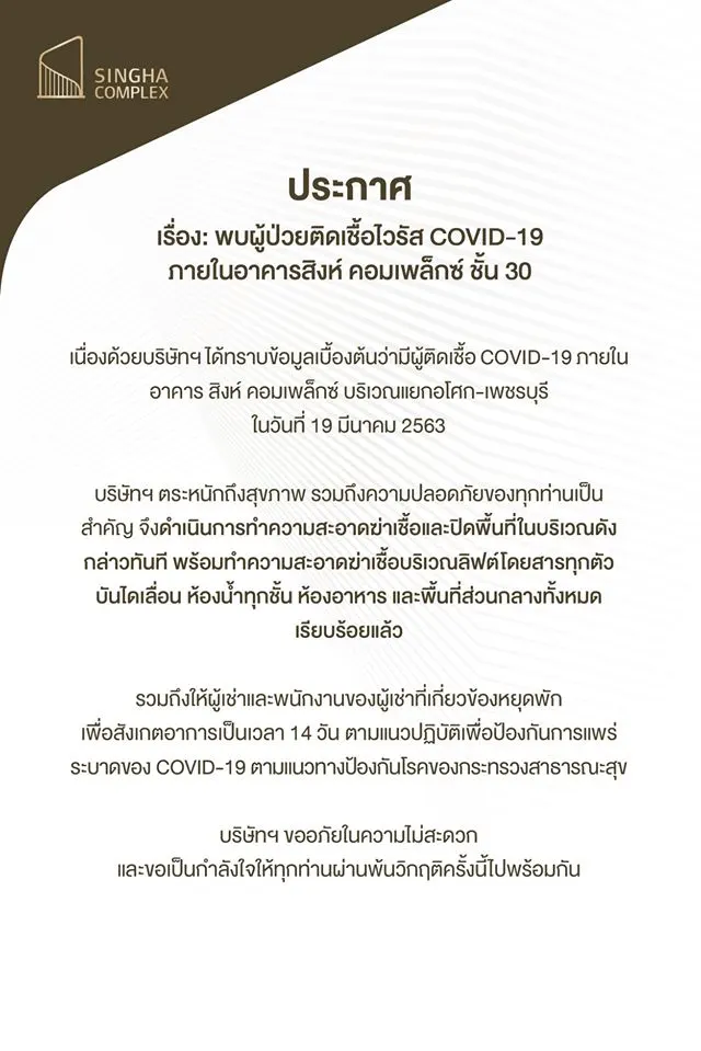 Singha Estate Public Company Limited or ‘S’ hereby announces Singha Property Development Co., Ltd. (or ‘Singha Property’), a subsidiary of Singha Estate located on the Asoke-Phetchaburi Intersection, was informed by Bangkok Rachathewi Centre Ltd., a tenant of Singha Complex Tower on the 30th floor, that one of its visitor was diagnosed with COVID-19.