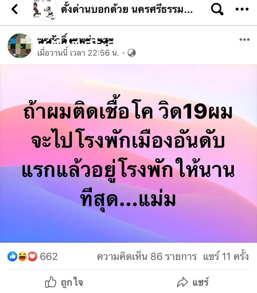 เฝ้าระวัง! หนุ่มสูงอายุโพส ถ้า "ถ้าผมติดเชื้อโควิด -19 จะไปโรงพักเมืองอันดับแรก"