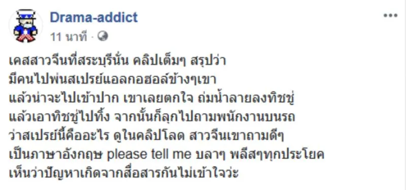 เมื่อสอบถามกับตำรวจ สภ เมืองสระบุรี ทราบว่า ขณะที่หญิงชาวจีนนั่งอยู่บนรถโดยสาร มีผู้โดยสารที่นั่งอยู่ด้านข้างฉีดสเปรย์ ซึ่งคาดว่าเป็นแอลกอฮอล์ ไปโดนหญิงชาวจีนคนดังกล่าวบริเวณปาก หญิงชาวจีนจึงตกใจพร้อมถ่มน้ำลายลงทิชชู่ แล้วเอาทิชชู่มาเช็ดที่ปาก ก่อนนำทิชชู่ดังกล่าวใส่ถังขยะ