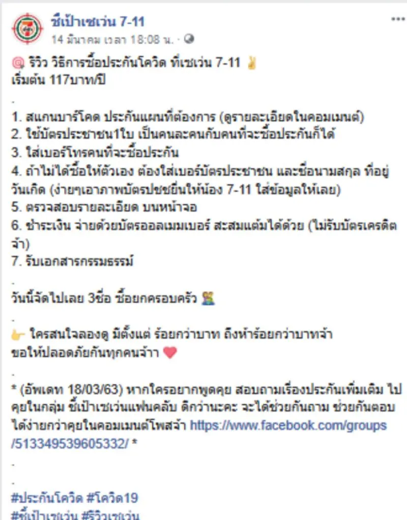 พอได้ยินข่าวพบผู้ติดcovid ในเมืองไทยมากขึ้น ก็ทำให้คนตื่นตัวและอดกังวลไม่ได้ว่า วันหนึ่งตัวเองอาจจะติดเชื้อไปด้วยหรือเปล่า จึงไม่แปลกใจที่ประกันภัยคุ้มครองการ COVID-19 จะขายดีเป็นเทน้ำเทท่า เอาเป็นว่าถ้าใครกำลังมองหาประกันโควิด 19 แบบที่เบี้ยประกันไม่แพง และสะดวกสบาย ราคาไม่แพง อย่างของเซเว่นนั้น โดยล่าสุดได้มีเพจเฟสบุ๊คที่ใช้ชื่อว่า ชี้เป้าเซเว่น 7-11 ได้มารีวิวการซื้อประกันในเซเว่น โดยได้ระบุข้อความว่า