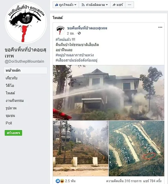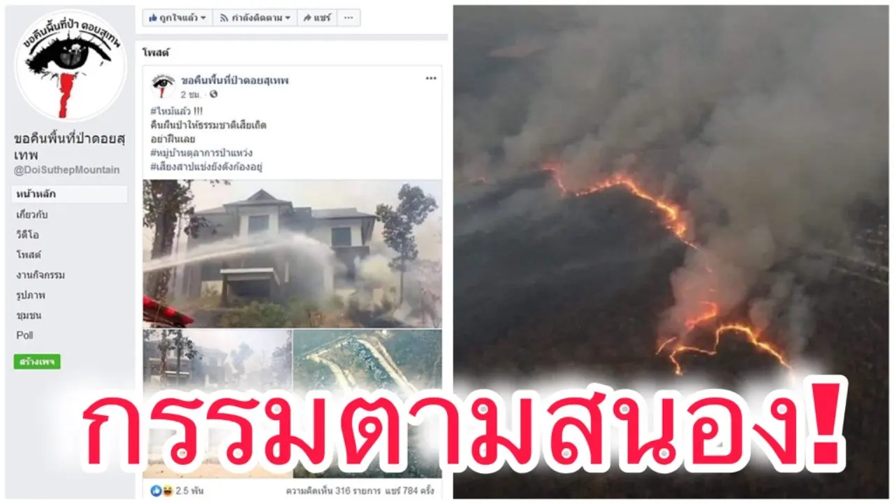 เพจ ขอคืนพื้นที่ป่าดอยสุเทพ โพสต์ภาพไฟป่ากำลังลุกลามไหม้ หมู่บ้านตุลาการป่าแหว่ง ที่จังหวัดเชียงใหม่ เจ้าหน้าที่ดับเพลิงกำลังฉีดน้ำเข้าดับไฟกันอุตลุด ภายหลังจากโพสต์ไม่นาน มีคอมเมนต์บนเพจจำนวนมากเป็นชาวเชียงใหม่ ว่า เป็นกรรมตามสนองและ ผิดผี และ “ขึดหลวง” คำล้านนา คือ “ความผิดมหันต์” ธรรมชาติจึงลงโทษ