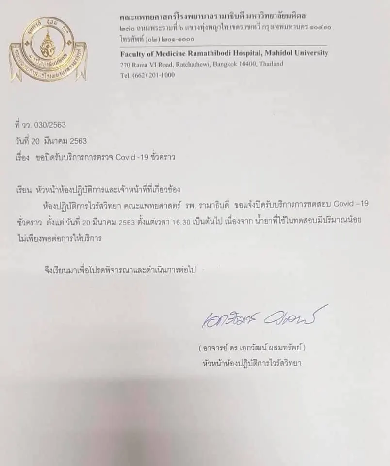 ล่าสุด รพ.รามาธิบดี ออกประกาศเรื่องขอปิดรับบริการตรวจโควิด-19 ชั่วคราว ว่า เรียนหัวหน้าห้องปฏิบัติการและเจ้าหน้าที่ที่เกี่ยวข้อง ห้องปฏิบัติการไวรัสวิทยา คณะแพทยศาสตร์ รพ.รามาธิบดี โดยระบุว่า ขอแจ้งปิดรับบริการการทดสอบโควิด-19 ชั่วคราว ตั้งแต่วันที่ 20 มี.ค.2563 เวลา 16.30 น. เนื่องจากน้ำยาที่ใช้ทดสอบมีปริมาณน้อย ไม่เพียงพอต่อการให้บริการ