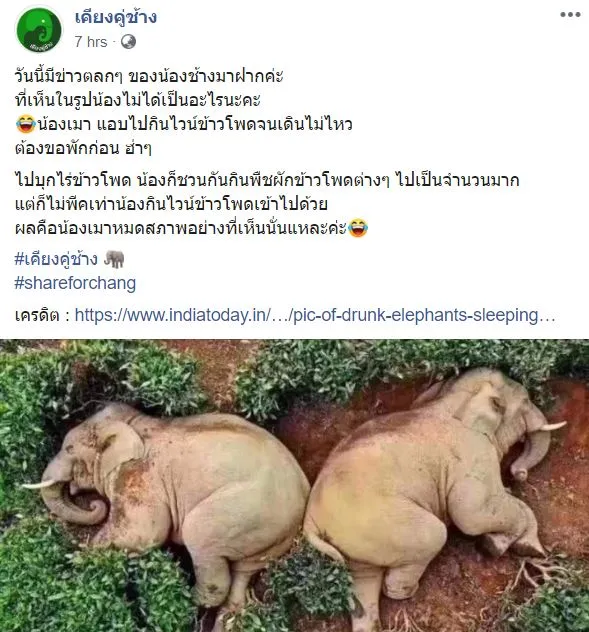 หลายๆคนหากเป็นภาพต่อไปนี้ ในตอนเเรกอาจจะต้องตกใจ ว่าช้างโขลงใหญ่ทำไมถึงได้มานอนเกลื่อน ซึ่งสื่อ indiatoday ได้เผยเเพร่ข่าวดังกล่าว เมื่อโขลงช้างได้บุกเข้าไปในไร่ข้าวโพดเเห่งหนึ่ง เพื่อเเอบหาของกินเป็นอาหาร เวลาต่อมาก็ได้เกิดภาพอย่างที่เห็นซึ่งทางเพจ เคียงคู่ช้าง ได้ทำเรื่องราวน่ารักๆของช้างโขลงดังกล่าว