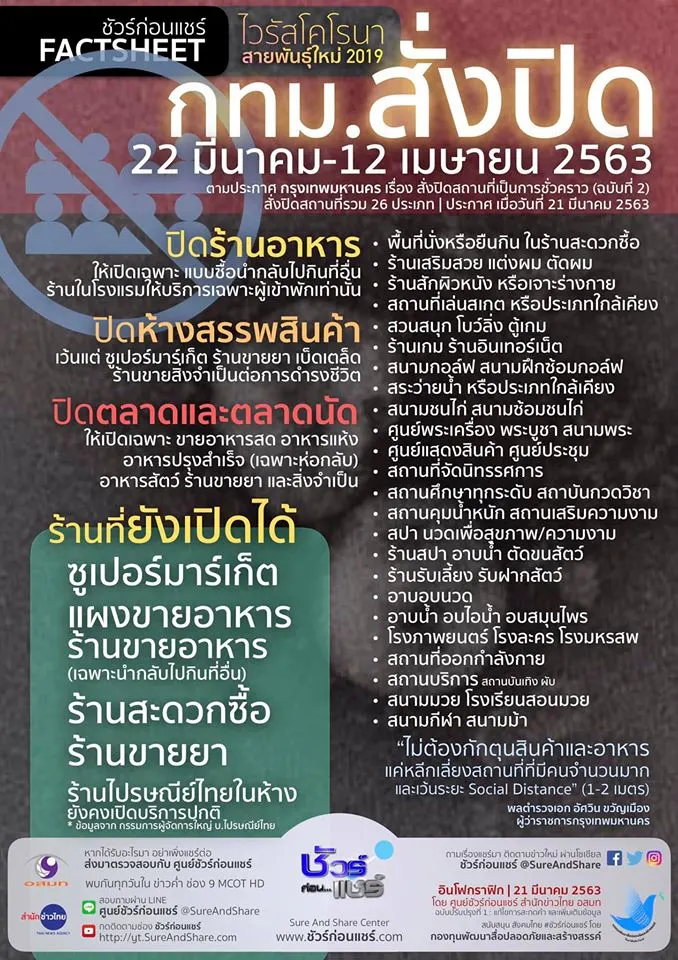 กทม. สั่งปิดสถานที่เสี่ยงเพิ่ม 22 วัน เริ่ม 22 มี.ค. -12 เม.ย. 63 เว้นซูเปอร์มาร์เก็ต ร้านสะดวกซื้อ ร้านอาหารขายได้เฉพาะหิ้วกลับบ้าน