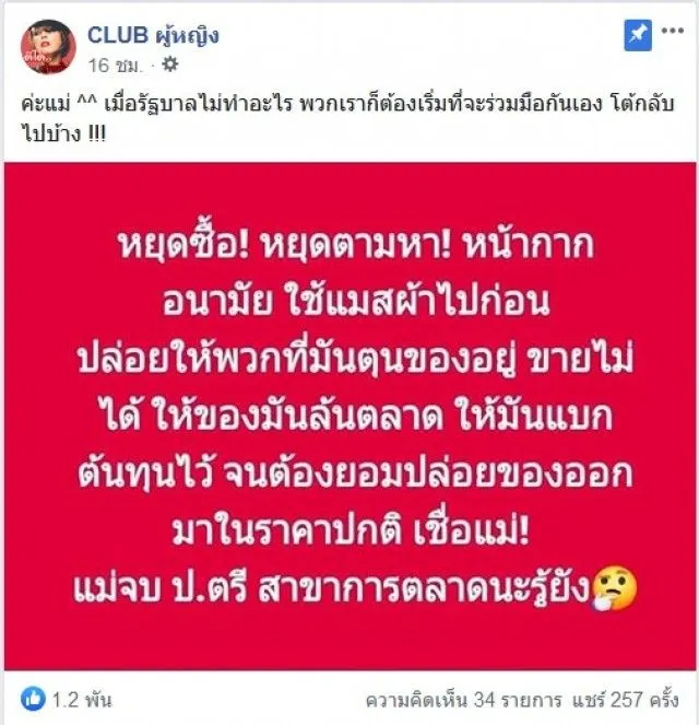 ล่าสุด ได้มีเพจเฟซบุ๊ค CLUB ผู้หญิง ได้ออกมาพูดว่า ถ้าเราหยุดตามหา ไม่สนับสนุนการซื้อหน้ากากอนามัยในราคาแพง เมื่อหน้ากากอนามัยล้นตลาด บรรดาผู้ค้าจะต้องทนไม่ไหว เอาหน้ากากอนามัยออกมาขายในราคาปกติ โดยเพจ CLUB ผู้หญิง ได้โพสต์ภาพพร้อมระบุข้อความว่า