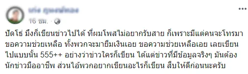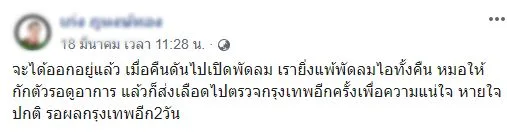 ล่าสุดหนุ่มรายนี้ได้ออกมาชี้แจงถึงเรื่องราวที่เกิดขึ้นถึงเหตุที่ต้องโพสต์ออกไปเช่นนั้น ระบุว่า… “ปัดโธ่ มึงก็เขียนข่าวไปได้ ที่ผมโพสต์ไม่อยากรับสาย ก็เพราะมีแต่คนจะโทร. มาขอความช่วยเหลือทั้งพวกจะมายืมเงินเอย ขอความช่วยเหลือเอย เลยเขียนไปแบบนั้น 555++ อย่างว่าข่าวใครก็เขียน ได้แต่ข่าวที่มีข้อมูลจริง ๆ มันต้องนักข่าวมืออาชีพ ส่วนไอ้พวกอยากเขียนอะไรก็เขียน สืบให้ดีก่อนนะครับ”เมื่อตรวจสอบย้อนไปพบว่าหนุ่มรายนี้กำลังจะได้ออกจากโรงพยาบาลและอาการดีขึ้นตามลำดับ ระบบหายใจกลับมาเป็นปกติเช่นเดิมไม่ได้รุนแรงอย่างที่เป็นข่าวก่อนหน้า