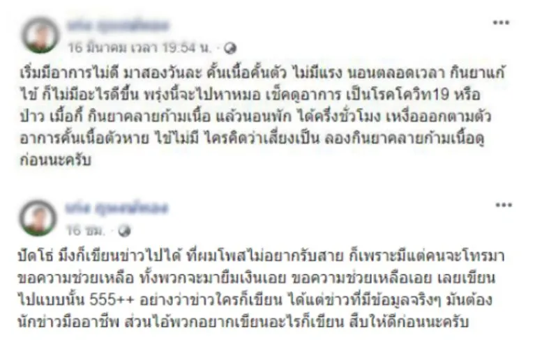 ล่าสุดหนุ่มรายนี้ได้ออกมาชี้แจงถึงเรื่องราวที่เกิดขึ้นถึงเหตุที่ต้องโพสต์ออกไปเช่นนั้น ระบุว่า ปัดโธ่ มึงก็เขียนข่าวไปได้ ที่ผมโพสต์ไม่อยากรับสาย ก็เพราะมีแต่คนจะโทร มาขอความช่วยเหลือทั้งพวกจะมายืมเงินเอย ขอความช่วยเหลือเอย เลยเขียนไปแบบนั้น 555 อย่างว่าข่าวใครก็เขียน ได้แต่ข่าวที่มีข้อมูลจริง ๆ มันต้องนักข่าวมืออาชีพ ส่วนไอ้พวกอยากเขียนอะไรก็เขียน สืบให้ดีก่อนนะครับ เมื่อตรวจสอบย้อนไปพบว่าหนุ่มรายนี้กำลังจะได้ออกจากโรงพยาบาลและอาการดีขึ้นตามลำดับ ระบบหายใจกลับมาเป็นปกติเช่นเดิมไม่ได้รุนแรงอย่างที่เป็นข่าวก่อนหน้า