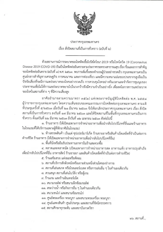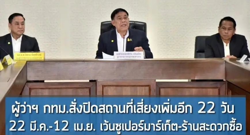 กทม. สั่งปิดสถานที่เสี่ยงเพิ่ม 22 วัน เริ่ม 22 มี.ค. -12 เม.ย. 63 เว้นซูเปอร์มาร์เก็ต ร้านสะดวกซื้อ ร้านอาหารขายได้เฉพาะสั่งกลับบ้าน ดิลิเวอรี่