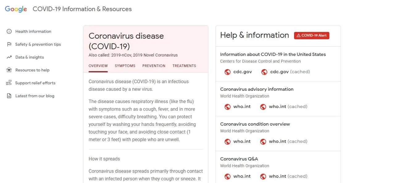 Google เปิดเว็บไซต์เกี่ยวกับโควิด-19 (https://www.google.com/covid19/) เพื่อเป็นแหล่งข้อมูลที่น่าเชื่อถือสำหรับสืบค้นเกี่ยวกับโรคระบาดดังกล่าว พร้อมคำแนะนำในการปฏิบัติตัวเพื่อความปลอดภัยสำหรับผู้คนทั่วโลก