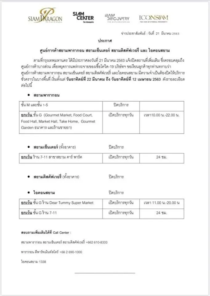 ศูนย์การค้าสยามพารากอน สยามเซ็นเตอร์ สยามดิสคัฟเวอรี และไอคอนสยาม ประกาศปิดบริการชั่วคราวในบางพื้นที่ เริ่มตั้งแต่ 22 มี.ค.-12 เม.ย. โดยมีรายละเอียดังนี้