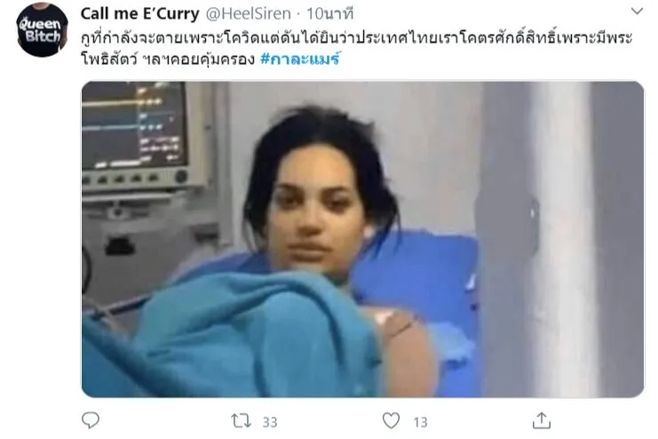 ด้านพิธีกรสาว กาละแมร์ พัชรศรี ที่อยู่ระหว่างการกักตัว ได้ไลฟ์สด พูดถึงสถานการณ์ต่างๆ โดยช่วงหนึ่ง ได้กล่าวถึงวิกฤติโควิด-19 ว่าไม่ต้องตกอกตกใจ วิกฤตครั้งนี้ ไม่ใช่วิกฤติครั้งแรกในประเทศชาติ ที่ผ่านมามีทั้งน้ำท่วม วิกฤติเศรษฐกิจต้มยำกุ้ง ไม่ต้องตกใจ ประเทศไทยผ่านมาได้แล้วทั้งนั้น ประเทศไทยศักดิ์สิทธิ์ มีพระโพธิสัตว์อยู่กี่พระองค์ มีพระเจ้าอยู่หัว รวมถึงเทพยดา สิ่งศักดิ์สิทธิ์คุ้มครองอยู่