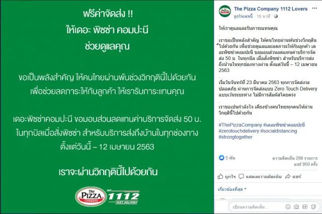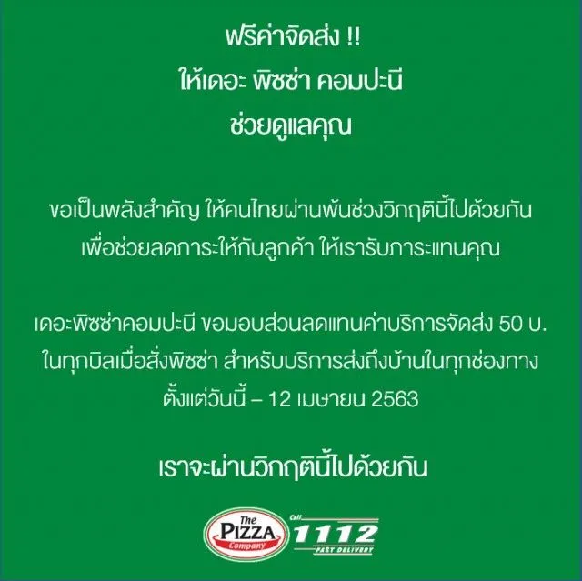 ให้เราดูแลและรับภาระแทนคุณ เราขอเป็นพลังสำคัญ ให้คนไทยผ่านพ้นช่วงวิกฤตินี้ไปด้วยกัน เพื่อช่วยดูแลและลดภาระให้กับลูกค้า เดอะพิซซ่าคอมปะนี ขอมอบส่วนลดแทนค่าบริการจัดส่ง 50 บ. ในทุกบิล เมื่อสั่งพิซซ่า สำหรับบริการส่งถึงบ้านในทุกช่องทางผ่าน ตั้งแต่วันนี้ ถึง 12 เมษายน 2563 เริ่มวันจันทร์ที่ 23 มีนาคม 2563 ทุกการจัดส่งจะปลอดภัย ผ่านการจัดส่งแบบ Zero Touch Delivery แบบเว้นระยะห่าง ไม่มีการสัมผัสโดยตรง เราขอเปนกำลังใจ เคียงข้างคนไทยทุกคนให้ผ่านวิกฤตินี้ไปด้วยกัน