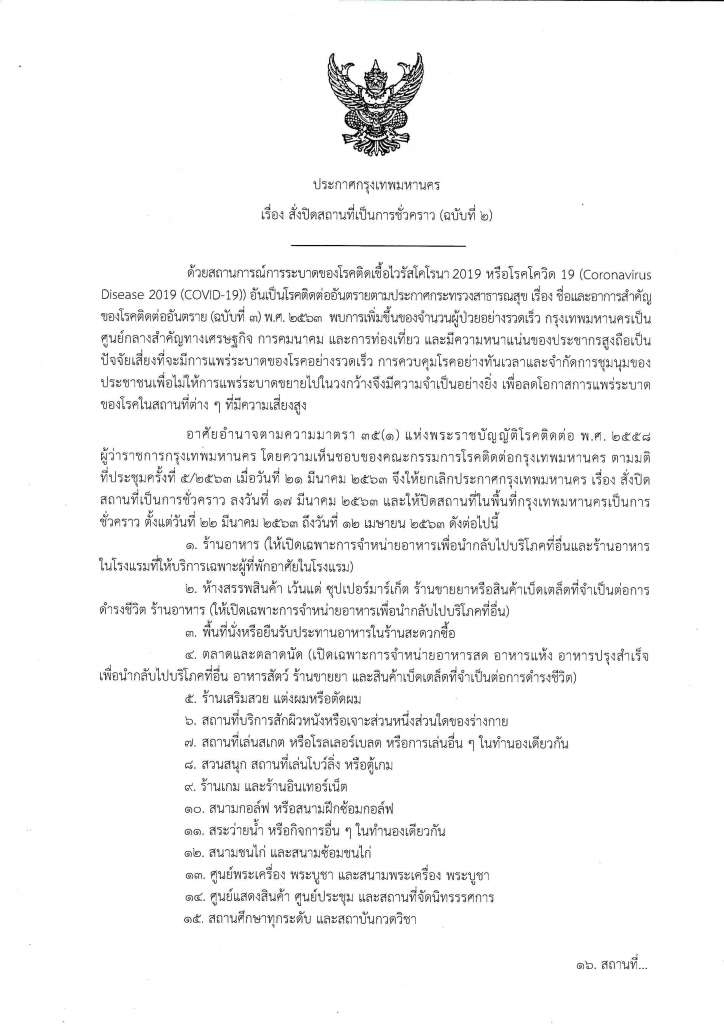 - ร้านอาหารรวมถึงร้านอาหารในคูหารถเข็นและแผงลอยจำหน่ายอาหารต้องจำหน่ายแบบซื้อกลับบ้านเท่านั้น