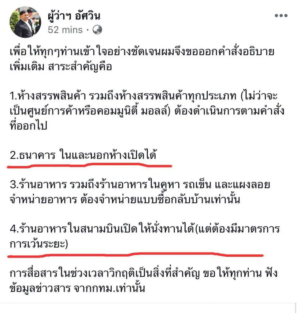 นอกจากนี้ ผู้ว่าฯ กทม. ยังได้โพสต์ผ่านเฟซบุ๊กส่วนตัวอีกว่า “เพื่อให้ทุกๆท่านเข้าใจอย่างชัดเจนผมจึงขอออกคำสั่งอธิบายเพิ่มเติมสาระสำคัญคือ