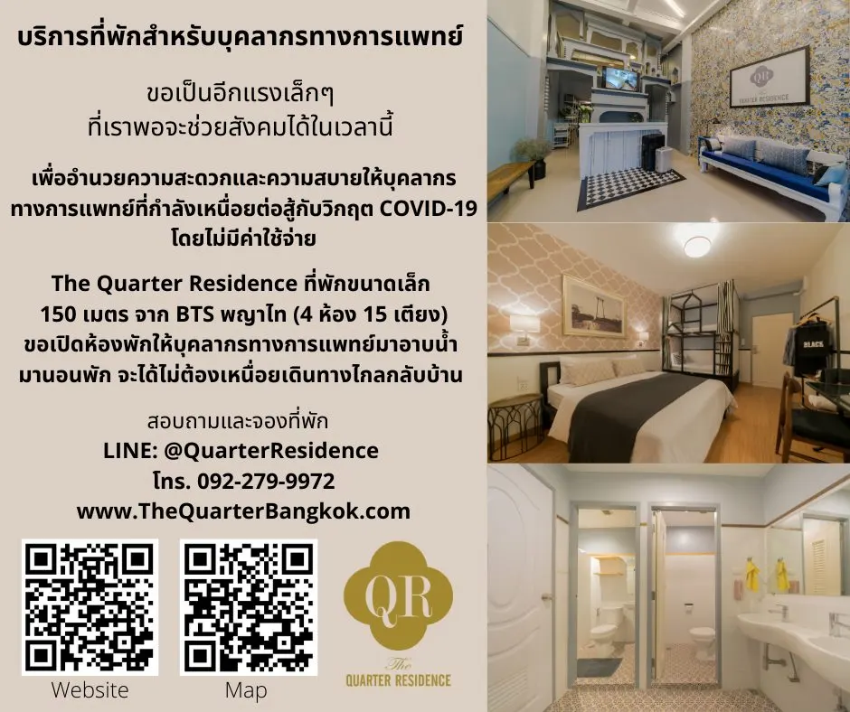 ปล. ดีใจเหลือเกินที่น้องทุกคนที่ The Quarters ได้ยินความคิดนี้แล้วรู้สึกดีและยินดีที่จะช่วยกัน ขอบคุณพี่น้องทุกคนที่ใจดี เพราะถ้าทุกคนไม่เอาด้วย…มันก็ไม่สามารถทำได้ #รัก” ซึ่งเดอะ ควอเตอร์ เรสซิเดนซ์ พญาไท (The Quarter Residence Phayathai) อยู่บริเวณ 69/73 ถนนพญาไท แขวงพญาไท เขตราชเทวี กรุงเทพฯ