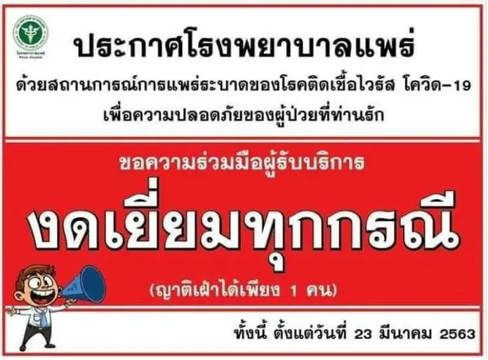 ด้าน รพ.แพร่ ออกประกาศ รพ.แพร่ ด้วยสถานการณ์การแพร่ระบาดของโรคติดเชื้อโควิด-19 เพื่อความปลอดภัยของผู้ป่วยที่ท่านรัก ขอความร่วมมือผู้รับบริการงดเยี่ยมทุกกรณี ญาติเฝ้าได้เพียง 1 คน ทั้งนี้ตั้งแต่วันที่ 23 มีนาคม 2563