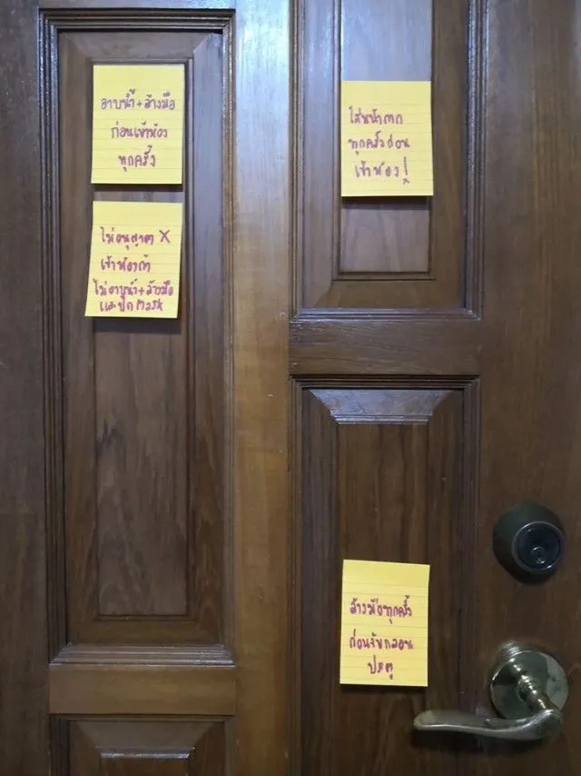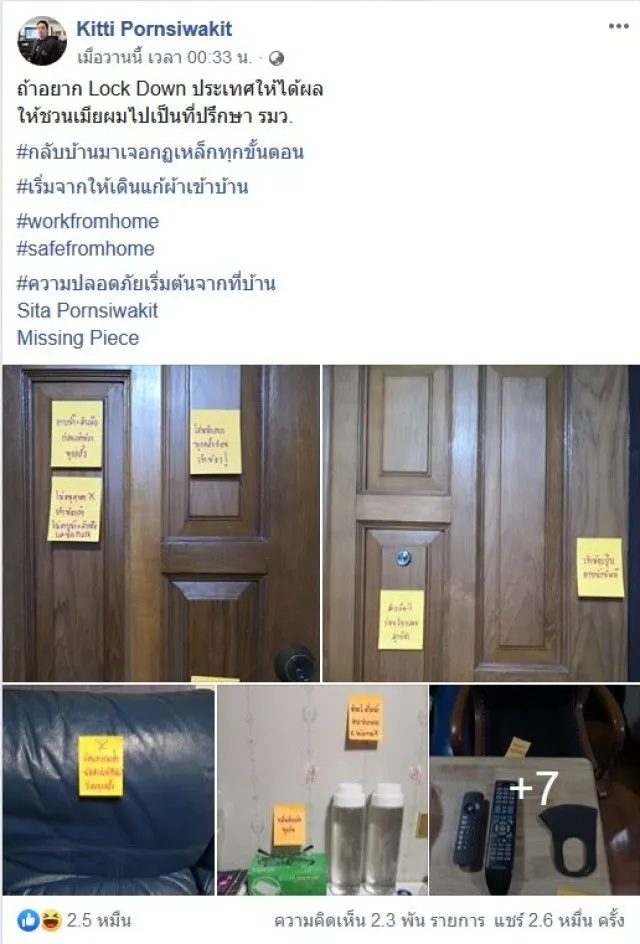 กลายเป็นอีกเรื่องราวที่น่าเอาเป็นเยี่ยงอย่างสำหรับผู้ใช้เฟซบุ๊ค Kitti Pornsiwakit ได้โพสต์มาตราการป้องกันสำหรับผู้ที่ต้องออกไปข้างนอกในช่วงที่ COVID กำลังติดต่อได้ง่ายอยู่ในขณะนี้ ซึ่งผู้ใช้เฟซบุ๊ค Kitti Pornsiwakit ได้โพสต์ภาพของภรรยาที่บ้านได้ติดกระดาษพร้อมข้อความไว้ทั่วบ้าน เพราะกลัวสามีจะลืมแล้วยังเน้นย้ำว่าให้คุณสามีปฏิบัติอย่างเคร่งครัดอีกด้วย