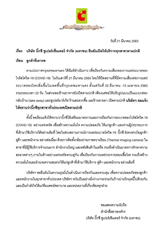 หลังจากที่ประชาชนแห่กักตุนอาหารเนื่องจากกลัวว่าห้างต่างๆจะปิดตัว ตามที่ทางคณะรัฐมนตรีได้มีมติดำเนินการ เพื่อป้องกัน CO VID ในวันเสาร์ที่ 21 มีนาคม 2563 โดยให้ปิดสถานที่ที่มีอาจจะแพร่กระจายเพิ่มขึ้นในเขตพื้นที่ กทม ตั้งแต่วันที่ 22 มีค ถึง 12 เมย 63 รวมระยะเวลา 22 วัน โดยบิ๊กซี ซุปเปอร์เซ็นเตอร์ในส่วนของร้านอาหารยังเปิดตามปกติ เพียงแต่ปรับรูปแบบเป็นแบบกล่องกลับบ้าน take away และซูเปอร์มารเก็ตร้านสะดวกซื้อและร้านขาย เวชภัณฑ์ ยังคงเปิดให้บริการ