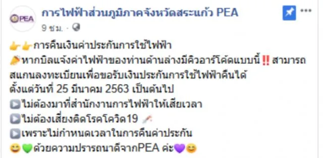 สำหรับการคืนเงินค่าประกันไฟฟ้า มีคำถามจากหลายๆคนว่าแสกนอย่างไร ต้องแสกนบาร์โค๊ดตรงไหน วันนี้เรามีคำตอบมาให้ได้หายสงสัยกัน เมื่อวันที่ 19 เพจ การไฟฟ้าส่วนภูมิภาคจังหวัดสระแก้ว PEA ได้โพสต์ข้อความระบุว่าการคืนเงินค่าประกันการใช้ไฟฟ้า หากบิลแจ้งค่าไฟฟ้าของท่านด้านล่างมีคิวอาร์โค้ดแบบนี้ สามารถสแกนลงทะเบียนเพื่อขอรับเงินประกันการใช้ไฟฟ้าคืนได้ ตั้งแต่วันที่ 25 มีนาคม 2563 เป็นต้นไป ไม่ต้องมาที่สำนักงานการไฟฟ้าให้เสียเวลา ไม่ต้องเสี่ยงติด CO VID เพราะไม่กำหนดเวลาในการคืนค่าประกัน ด้วยความปรารถนาดีจากPEA ค่ะ