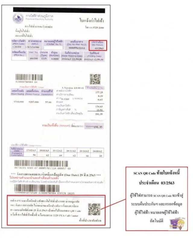 แสกน คิวอาร์โค้ต ท้ายบิลประจำเดือน มีนาคม 63 จากนั้นจะเข้าสู่ระบบประกัน กรอกข้อมูลผู้ใช้ไฟฟ้า หมายเลขผู้ใช้ไฟฟ้า อัตโนมัติ