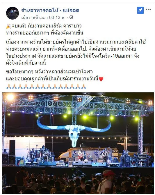 เมื่อวันที่ 18 มีนาคม 2563 ที่ผ่านมา วงดนตรี คาราบาว เดินทางไปเล่นคอนเสิร์ตที่ ร้านอาหารตอไม้ – แม่สอด ซึ่งมีผู้ร่วมชมจำนวนมาก โดยภายหลังจบคอนเสิร์ตทางร้านได้โพสต์ชี้แจงหน้าเพจเฟซบุ๊ก ถึงเหตุผลที่ต้องจัดคอนเสิร์ตดังกล่าวตามกำหนดการเดิม