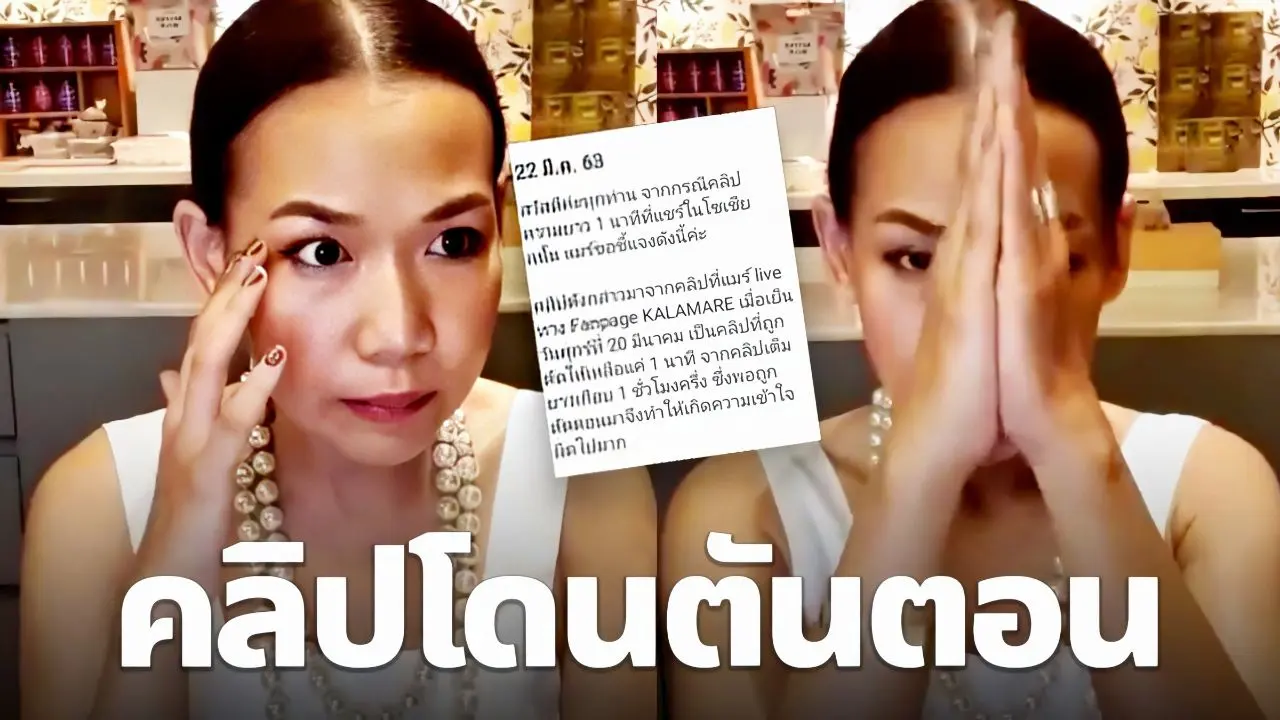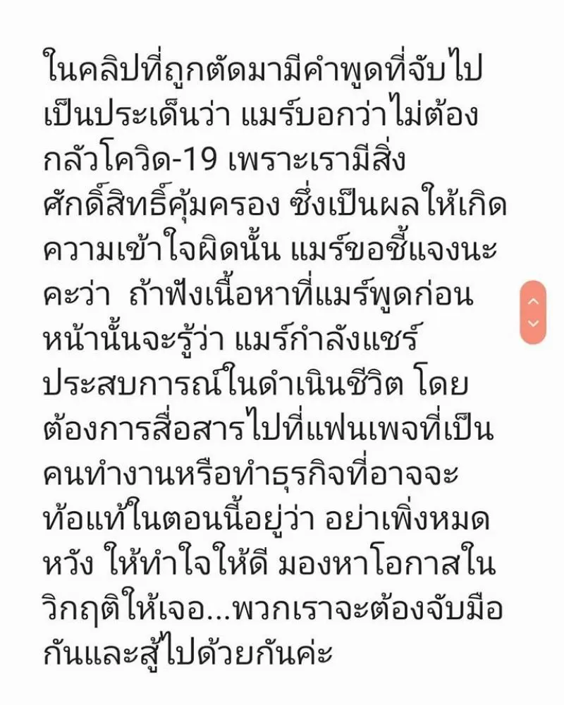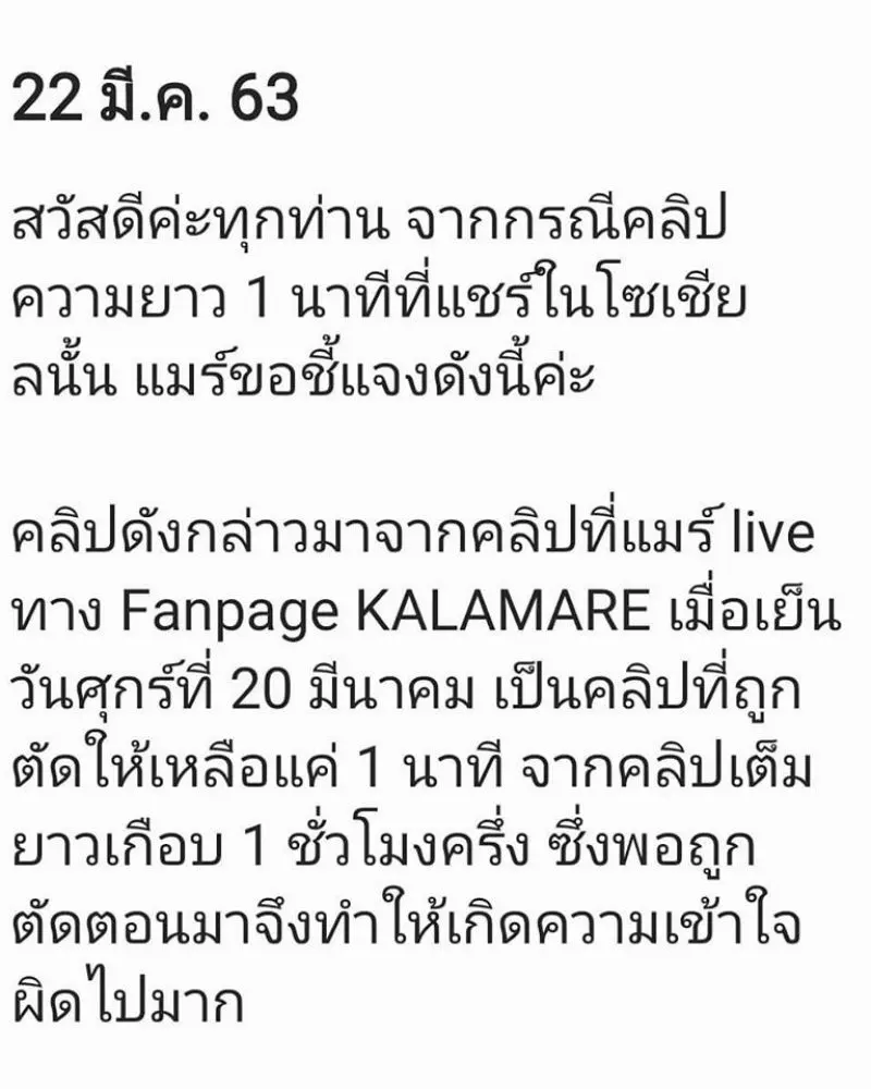 สวัสดีค่ะทุกท่าน จากกรณีคลิปความยาว 1 นาทีที่แชร์ในโซเชียลนั้น แมร์ขอชี้แจงดังนี้ค่ะคลิปดังกล่าวมาจากคลิปที่แมร์ liveทาง Fanpage KALAMARE เมื่อเย็นวันศุกร์ที่ 20 มีนาคม เป็นคลิปที่ถูกตัดให้เหลือแค่ 1 นาที จากคลิปเต็มยาวเกือบ 1 ชั่วโมงครึ่ง ซึ่งพอถูกตัดตอนมาจึงทำให้เกิดความเข้าใจผิดไปมาก ในคลิปที่ถูกตัดมามีคำพูดที่จับไปเป็นประเด็นว่า แมร์บอกว่าไม่ต้องกลัวโควิด-19 เพราะเรามีสิ่งศักดิ์สิทธิ์คุ้มครอง ซึ่งเป็นผลให้เกิดความเข้าใจผิดนั้น แมร์ขอชี้แจงนะคะว่า ถ้าฟังเนื้อหาที่แมร์พูดก่อนหน้านั้นจะรู้ว่า แมร์กำลังแชร์ประสบการณ์ในดำเนินชีวิต โดยต้องการสื่อสารไปที่แฟนเพจที่เป็นคนทำงานหรือทำธุรกิจที่อาจจะท้อแท้ในตอนนี้อยู่ว่า อย่าเพิ่งหมดหวัง ให้ทำใจให้ดี มองหาโอกาสในวิกฤติให้เจอ พวกเราจะต้องจับมือกันและสู้ไปด้วยกันค่ะ
