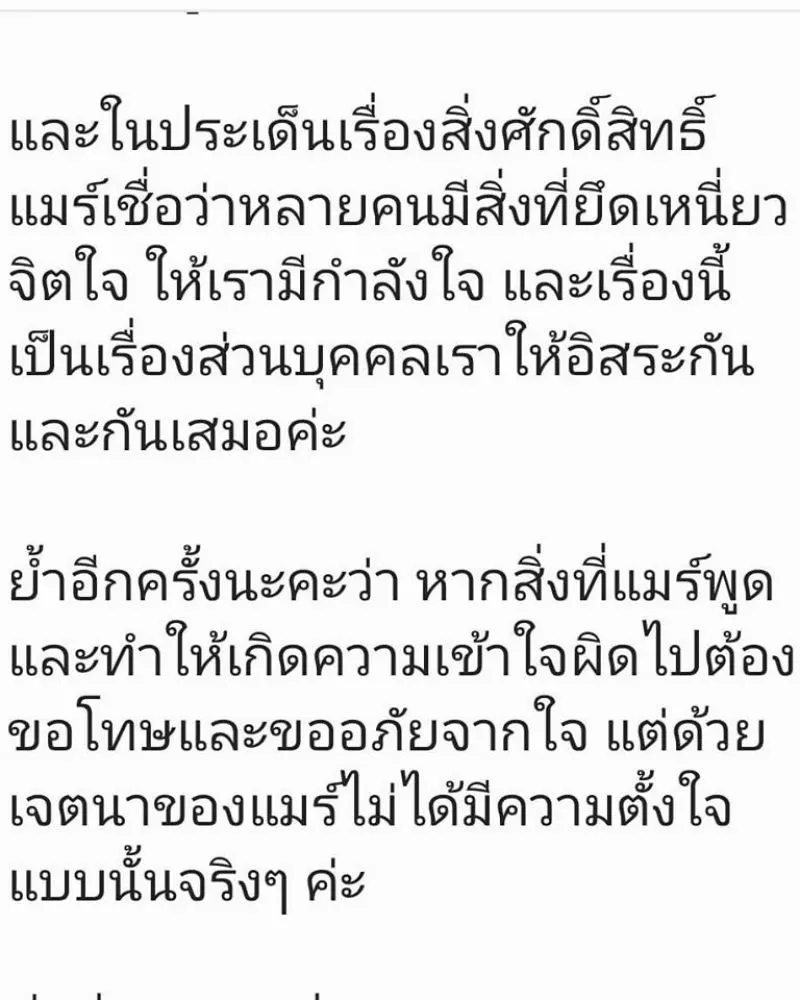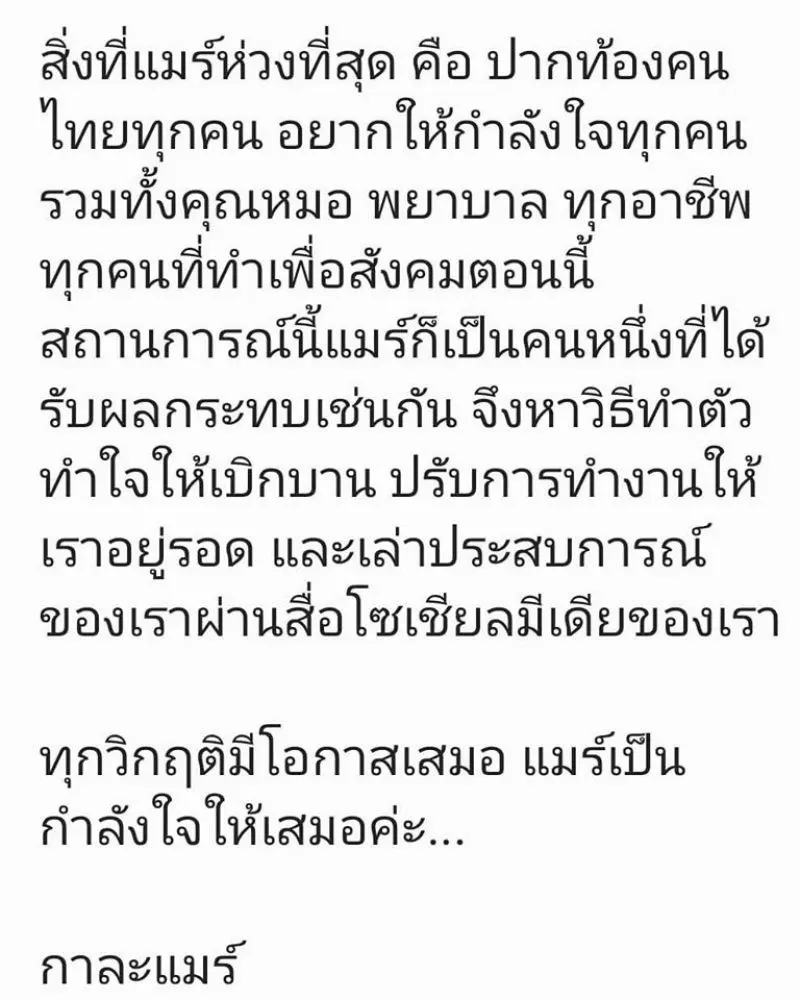 และในประเด็นเรื่องสิ่งศักดิ์สิทธิ์แมร์เชื่อว่าหลายคนมีสิ่งที่ยึดเหนี่ยวจิตใจ ให้เรามีกำลังใจ และเรื่องนี้ี้เป็นเรื่องส่วนบุคคลเราให้อิสระกันและกันเสมอค่ะย้ำอีกครั้งนะคะว่า หากสิ่งที่แมร์พูดและทำให้เกิดความเข้าใจผิดไปต้องขอโทษและขออภัยจากใจ แต่ด้วยเจตนาของแมร์ไม่ได้มีความตั้งใจแบบนั้นจริงๆ คะ สิ่งที่แมร์ห่วงที่สุด คือ ปากท้องคนไทยทุกคน อยากให้กำลังใจทุกคนรวมทั้งคุณหมอ พยาบาล ทุกอาชีพทุกคนที่ทำเพื่อสังคมตอนนี้ สถานการณ์นี้แมร์ก็เป็นคนหนึ่งที่ได้รับผลกระทบเช่นกัน จึงหาวิธีทำตัวทำใจให้เบิกบาน ปรับการทำงานให้เราอยู่รอด และเล่าประสบการณ์ของเราผ่านสื่อโซเชียลมีเดียของเราทุกวิกฤติมีโอกาสเสมอ แมร์เป็นกำลังใจให้เสมอค่ะ กาละแมร์