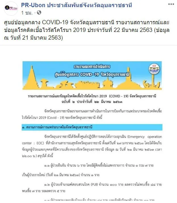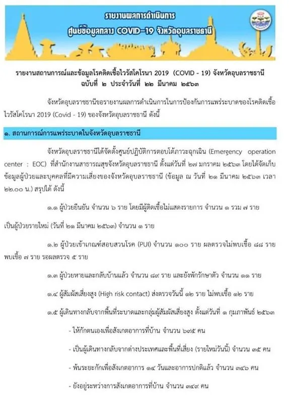 ศูนย์ข้อมูลกลางโควิด-19 จ.อุบลราชธานี รายงานสถานการณ์และข้อมูลโรคติดเชื้อไวรัสโคโรนา 2019 ประจำวันที่ 22 มีนาคม 2563 (ข้อมูล ณ วันที่ 21 มีนาคม 2563)