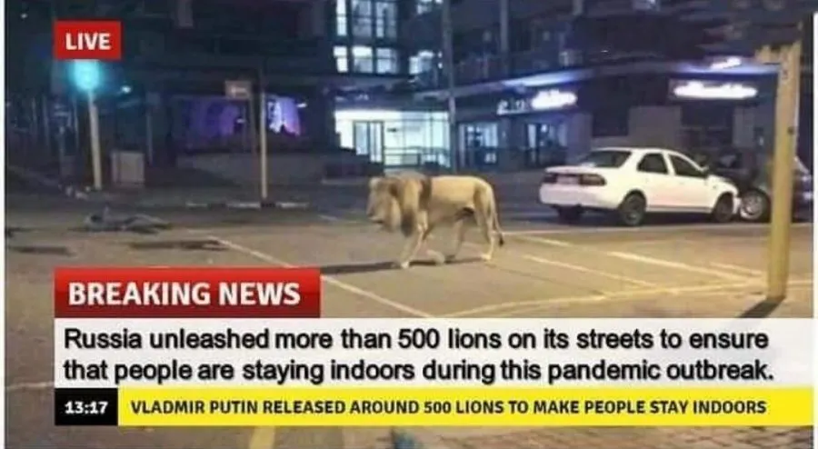 คุณคะ ที่เขาบอกว่าคุณพี่ปูติน ณ รัสเซียปล่อยสิงโตกว่า 500 ตัว (บ้างก็อัพจำนวนเป็น 800 ตัว) ให้ไปตามถนน เพื่อให้คนไม่กล้าออกจากการบ้าน