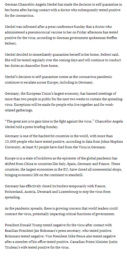 อังเกลา แมร์เคิล นายกฯเยอรมัน ต้องถูกกักตัว หลังจากที่หมอที่ฉีดวัคซีนให้เธอเมื่อสัปดาห์ที่ผ่านมา ตรวจพบว่าติดเชื้อ covid-19 แต่ระหว่างถูกกักตัวที่บ้าน เธอก็จะปฎิบัติหน้าที่ในฐานะนายกต่อไปจากที่บ้านของเธอ