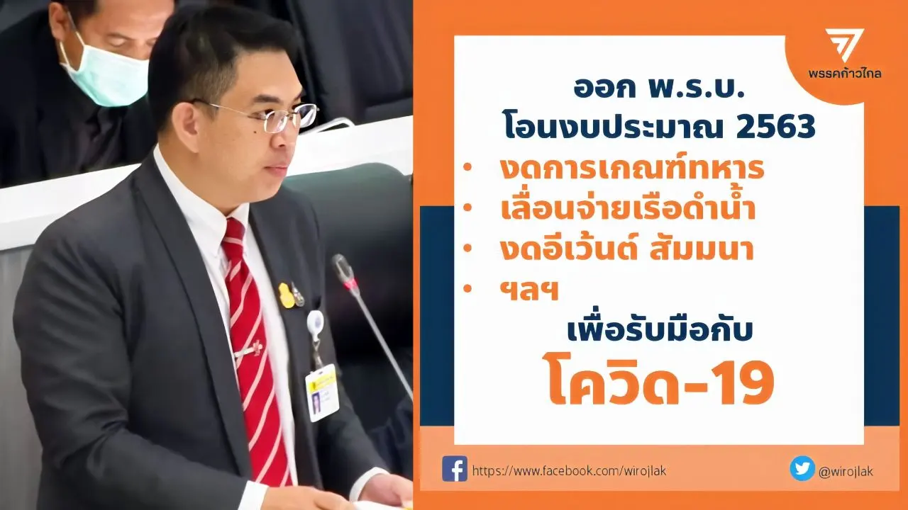 อย่างไรก็ดี รัฐบาลมีความจำเป็นอย่างยิ่ง ที่จะต้องเตรียมงบประมาณเอาไว้เยียวยาเศรษฐกิจที่เกิดขึืน ในระดับ 1.5 - 2 แสนล้านบาท ซึ่งก่อนที่รัฐบาลจะใช้วิธีการ ออก พ.ร.บ. หรือ พ.ร.ก. กู้เงิน เบื้องต้นรัฐบาลควรพิจารณาใช้มาตรา 35 พ.ร.บ.วิธีการงบประมาณ พ.ศ.2561 ในการโอนงบประมาณ ปีงบประมาณ พ.ศ.2563 จากหน่วยรับงบประมาณที่ไม่มีความจำเป็นต้องใช้งบประมาณ มาให้กับหน่วยรับงบประมาณ ที่มีความจำเป็นต้องใช้งบประมาณในการทำภารกิจด้านการสาธารณสุข และการเยียวยาทางเศรษฐกิจให้กับประชาชน โดยเฉพาะคนตัวเล็กตัวน้อย และแรงงานนอกระบบ (คนไทยที่ทำงานเป็นลูกจ้างรายวัน ผู้ประกอบอาชีพอิสระ รับจ้างทั่วไป หาบเร่แผงลอย ที่ไม่อยู่ในระบบประกันสังคม) ที่จนถึงวันนี้ รัฐบาลยังไม่มีมาตรการใดๆ ออกมาอย่างชัดเจน