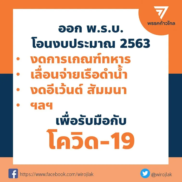 21 มีนาคม 2563 ดร.วิโรจน์ ลักขณาอดิศร ส.ส.บัญชีรายชื่อ และโฆษกพรรคก้าวไกล ที่ก่อนหน้าที่เคยอภิปรายกรณี IO ในสภามาก่อน ล่าสุดได้โพสท์ผ่านเฟซบุ๊ค เสนอรัฐบาล โยกงบเกณฑ์ทหาร-ซื้อเรือดำน้ำ เกือบ 7 หมื่นล้าน สู้โควิด-19 โดยได้โพสท์ระบุว่า