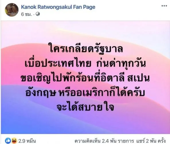 “ใครเกลียดรัฐบาล เบื่อประเทศไทย ก่อนด่าทุกวัน ขอเชิญไปพักร้อนที่อิตาลี สเปน อังกฤษ หรืออเมริกาก็ได้ครับ จะได้สบายใจ”